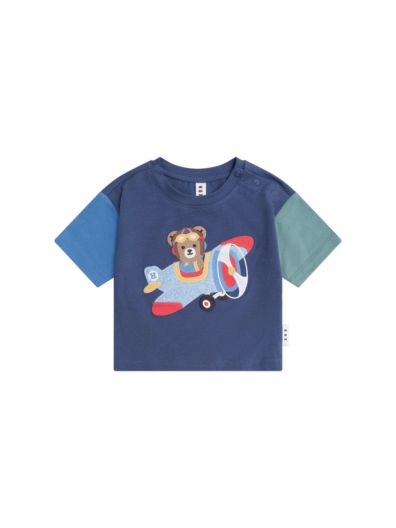 The perfect everyday tee, but with an aviator twist. This boxy t-shirt is made from buttery-soft organic cotton in navy colour block and features an aviator Huxbear embroidered on the tummy. Baby sizes feature stainless steel shoulder snaps for quick changes. 95% organic cotton, 5% elastane Navy colour block Designed in Melbourne