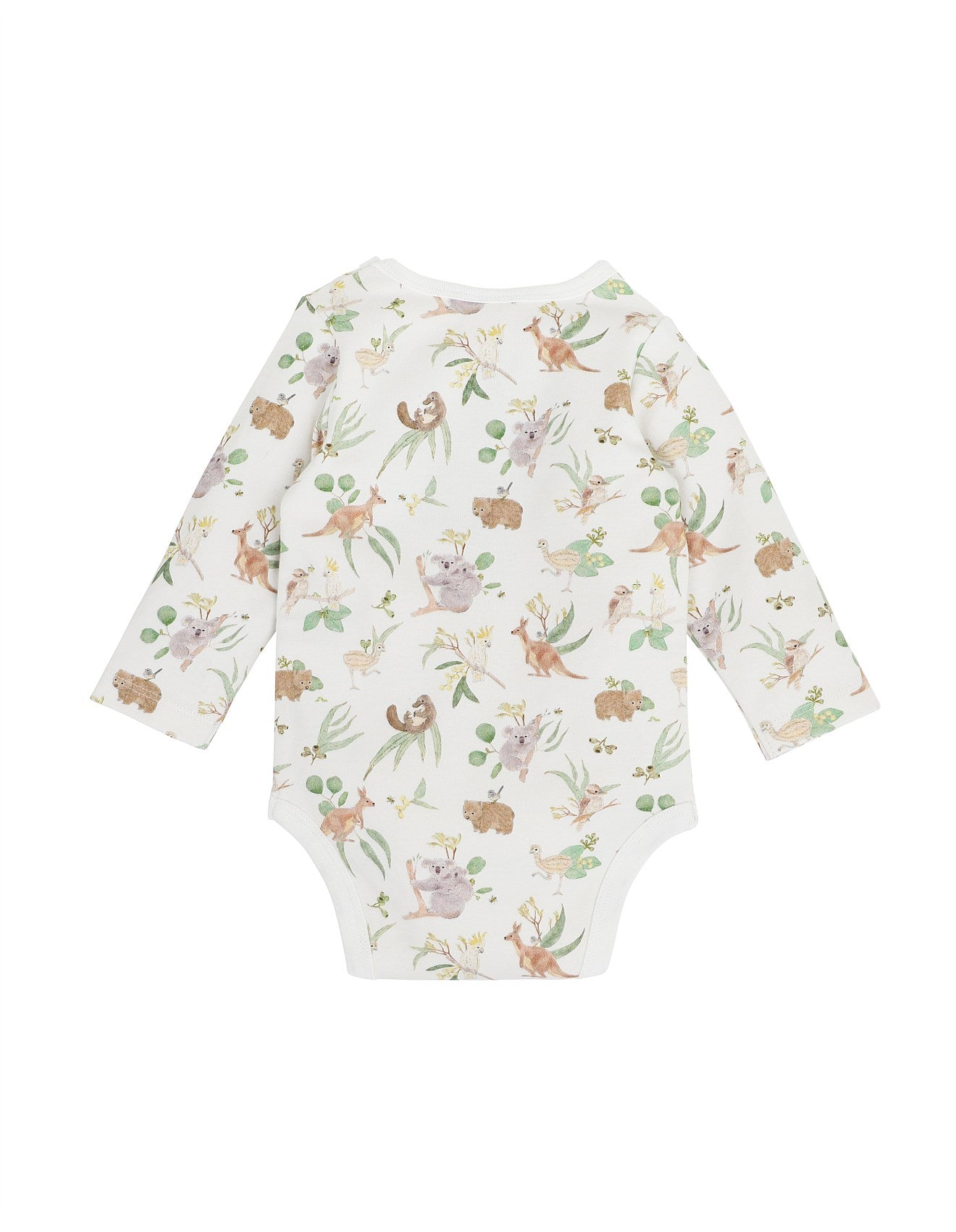 This 100% organic cotton interlock knit bodysuit features an Australian native print with contrast neck and leg binding, long sleeves, a concealed press stud shoulder opening and crotch press stud opening for ease of dressing and nappy changes and is a great cute basic for your little one's Winter wardrobe.