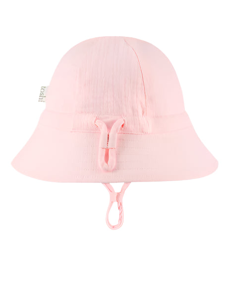 Toshi Bell Hat Sammy is crafted from the finest quality certified 100% organic cotton yarn. Toshi Bell Hat Sammy is a flattering bell shaped hat. The cheesecloth fabrication features a supremely soft and gently nurturing texture. The UPF 50+ UV rating indicates maximum sun protection. A head tie with soft cotton toggle creates adjustable sizing. The chinstrap with soft cotton toggle secures the hat and offers ease of wear. The security release clasp on the chin tie is designed to enhance wearer safety. The sunhat is fully lined for increased comfort.