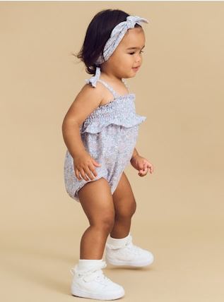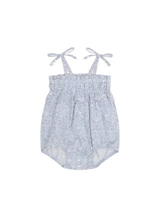 Super soft, premium organic cotton jersey frill bubble romper with all over bluebell print and decorative bow on straps