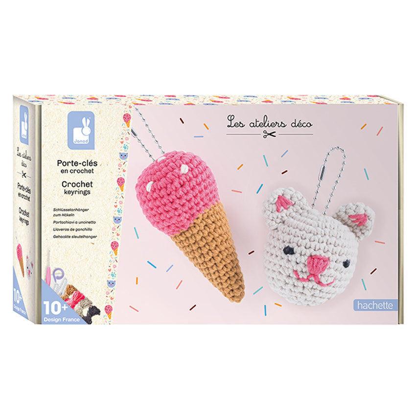 Crochet is making a big comeback! It's a calming activity that's easy to learn the basics and the Janod Crochet Keyring Kit includes everything you need to make two gorgeous keyrings. Recommended for children over the age of 10 it will help them develop fine motor skills concentration and creativity. Using the four included balls of wool there are enough materials to make a pretty ice cream and a super-cute kitten. The kit also contains a crochet hook 2 chains with clasps a plastic needle a marker ring and an instruction booklet. Hang the keyrings on your bag or gift them to friends. If you love craft Janod have many creative kits in their range to choose from!