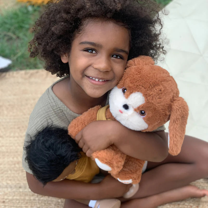 Made from soft plush fabric that is recycled with velvety ears to nuzzle, Buddy is fully poseable and can stand, lay down and even sit! Buddy's head moves and is embroidered with the sweetest doggy face, plus there's a rainbow surprise on one of Buddy's little paws!