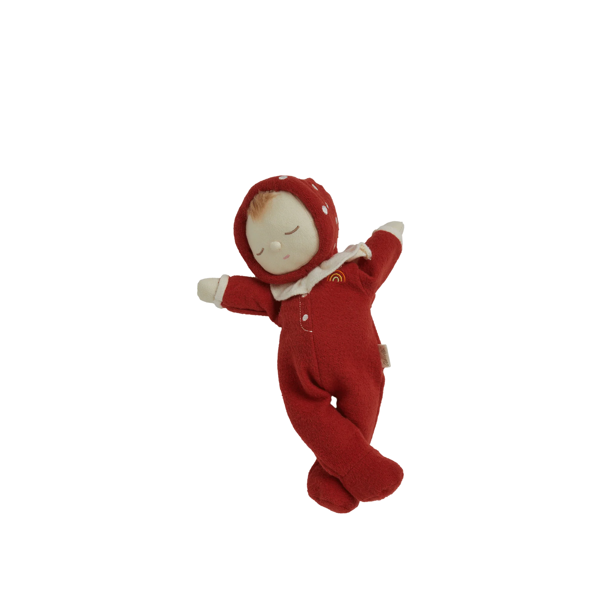 Rosy red and ready to snuggle, Toadstool Moppet brings a sprinkle of forest magic to every cuddle. With a mushroom-cap hood complete with embroidered spots, a frilly collar, and the softest cottony suit, this Dozy Dinkum is made for dreaming.
