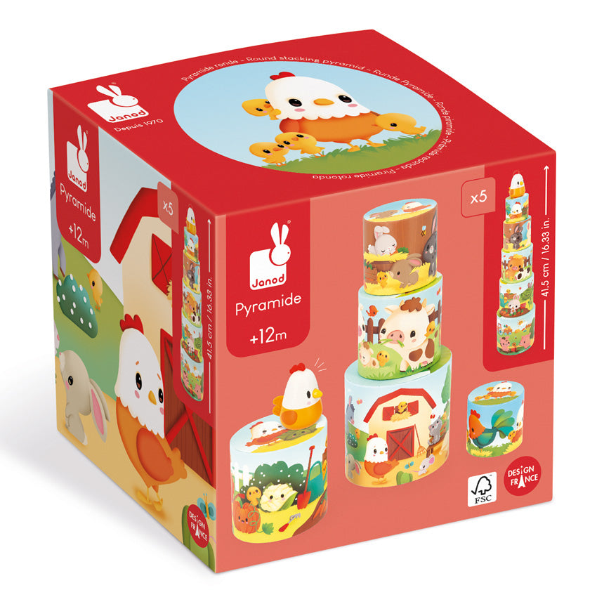 The chicks have been out playing with all the other animals on the farm but it's time to go back to the henhouse! The 5 nesting and stacking cylinders are beautifully illustrated with pigs cows rabbits not forgetting the farmyard! An adorable wooden mother hen figurine is also included she's looking for her chicks that have run off to explore the farm. Hide the figurine under the cylinders or find all the chicks illustrated in the different scenes! This round stacker offers several different ways of playing and is perfect for developing young children?s dexterity observation skills problem solving and imagination all while having fun! Presented in a sturdy storage box and made from FSC certified wood and cardboard.