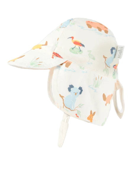 Flap Cap Down Under is an iconic Toshi baby sunhat. The UPF 50+ UV rating indicates maximum sun protection. Shielding precious babies from the elements is the primary focus in the creation of this sunhat. The Toshi Flap Cap has a contoured neck flap for enhanced sun protection. A head tie with soft cotton toggle creates adjustable sizing. The chin tie with soft cotton toggle secures the hat and offers ease of wear. The security release clasp on the chin tie is designed to enhance wearer safety. The cap is fully lined for increased comfort. Made from the finest quality cotton knit, the baby sunhat is gentle to wear, functional and practical. An original and exclusive Toshi print design is featured.