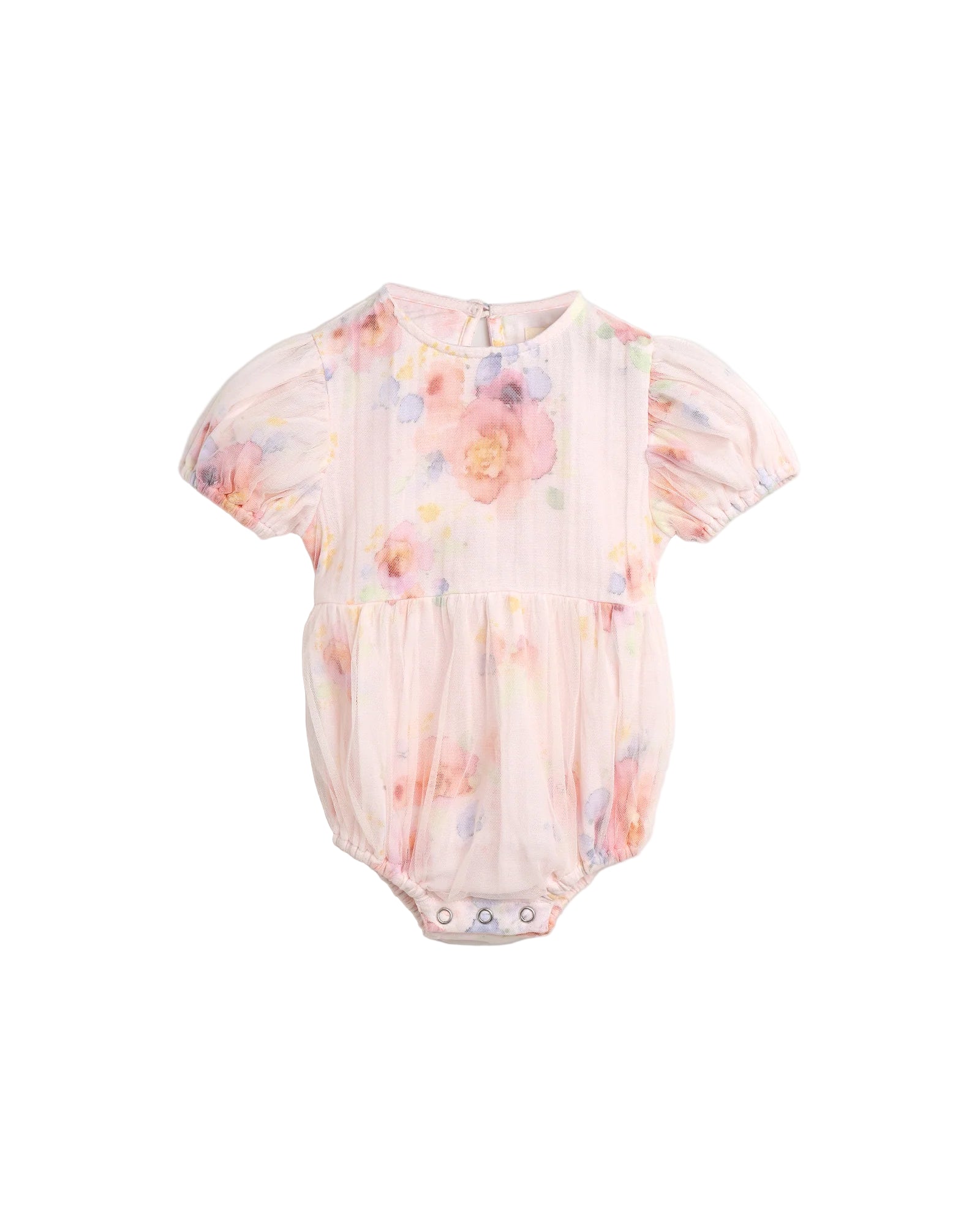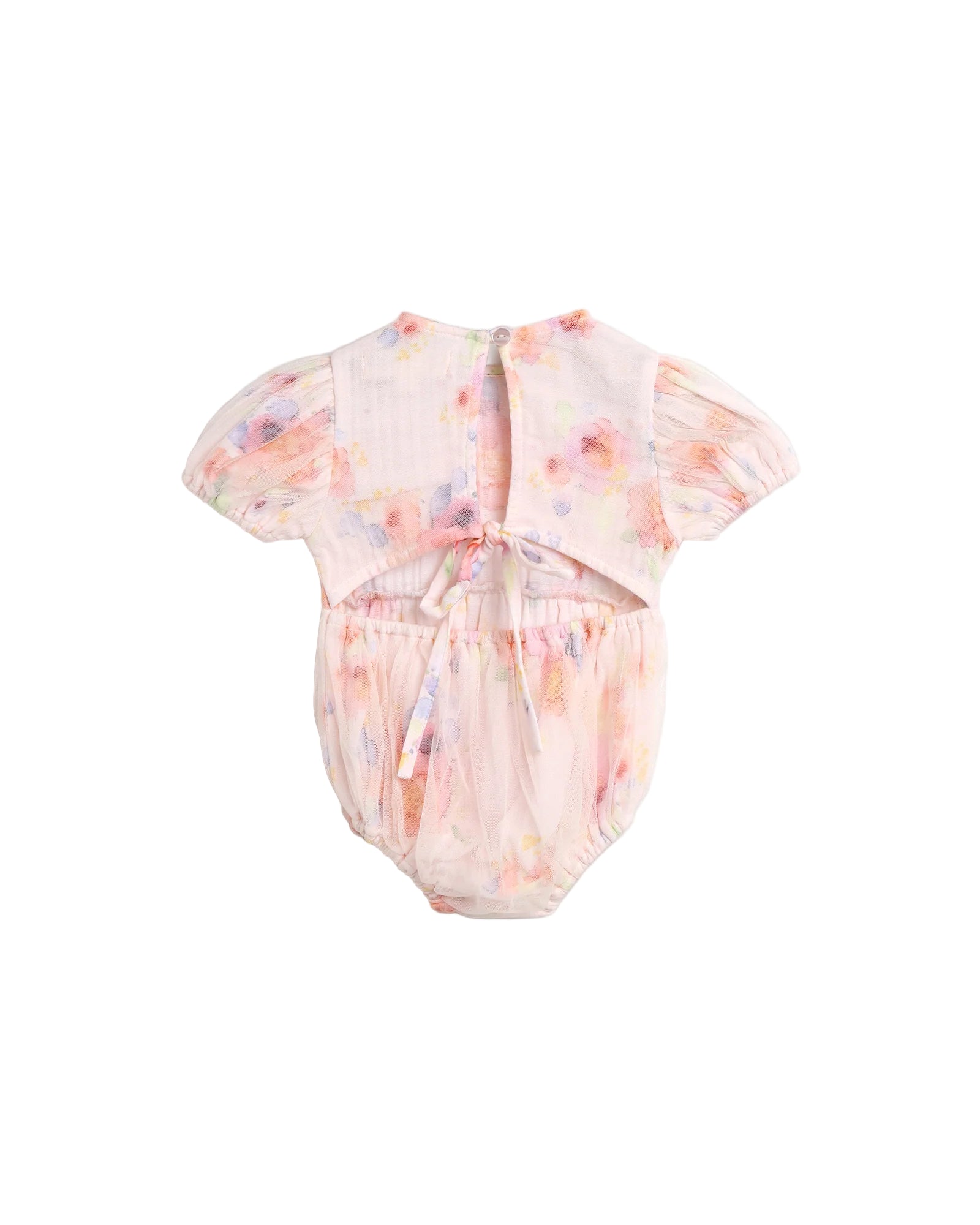 The Kimmy Playsuit in Roses. Dress your little one in pure elegance with this enchanting tulle overlay romper. Featuring voluminous, puffy full sleeves and a delicate tulle overlay, this design is perfect for special occasions and celebrations.