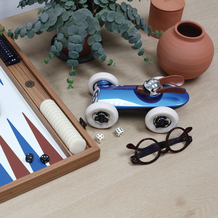 Rufus Bertie is the picture of style in his metallic blue racing car! With the wind rushing through his ears, his goggles and chrome helmet keep him safe while he zooms around the track in style. The classy white tyres with chrome trims add a touch of elegance to this charming toy. Originally designed by Playforever for Hugo Boss, the Rufus model was so popular it evolved into its own exclusive range. Crafted from durable, heavy-duty plastic, this beautifully nostalgic car is built to last and looks just as impressive on display as it does in play.