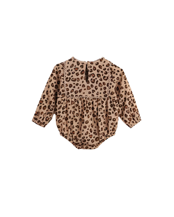 Introducing the Ophelia Playsuit in Leopard ... an elegant piece for your baby's wardrobe. Crafted from the softest cotton gauze and adorned with an exquisite lace trim.