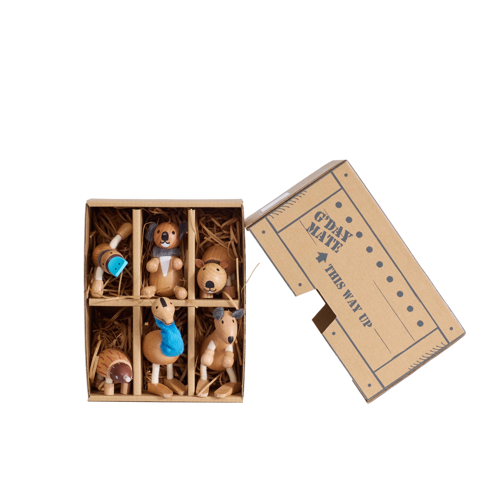 Bring home a little piece of the outback with this beautifully boxed set of six Aussie Anamalz — handcrafted, sustainable, and full of character. Packaged in a sturdy cardboard gift crate, it includes soft, snuggly padding. Each animal is made from FSC-certified beech wood, plush fabric, bendy rope, and recyclable TPR. Designed for ages 3+ and backed by our lifetime guarantee.