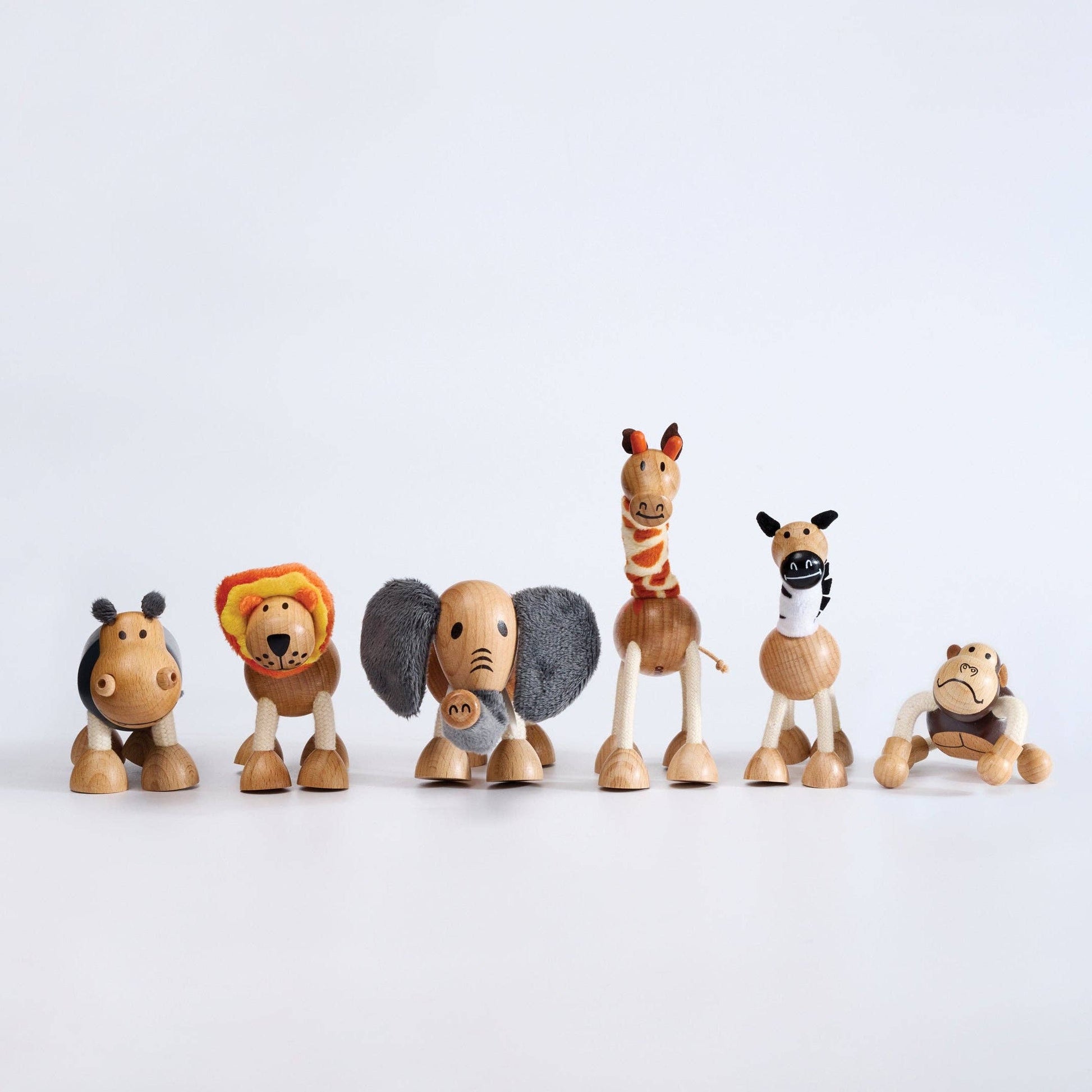 Bring the wild home with this boxed set of six safari-inspired Anamalz: Elephant, Giraffe, Gorilla, Hippo, Lion, and Zebra. Each is handcrafted from FSC-certified beech wood, plush fabrics, bendy rope, and recyclable TPR — designed for ages 3+ and backed by our lifetime guarantee. Packaged in a sturdy cardboard gift crate with soft, snuggly padding to keep your animals safe, sound, and ready to roam.
