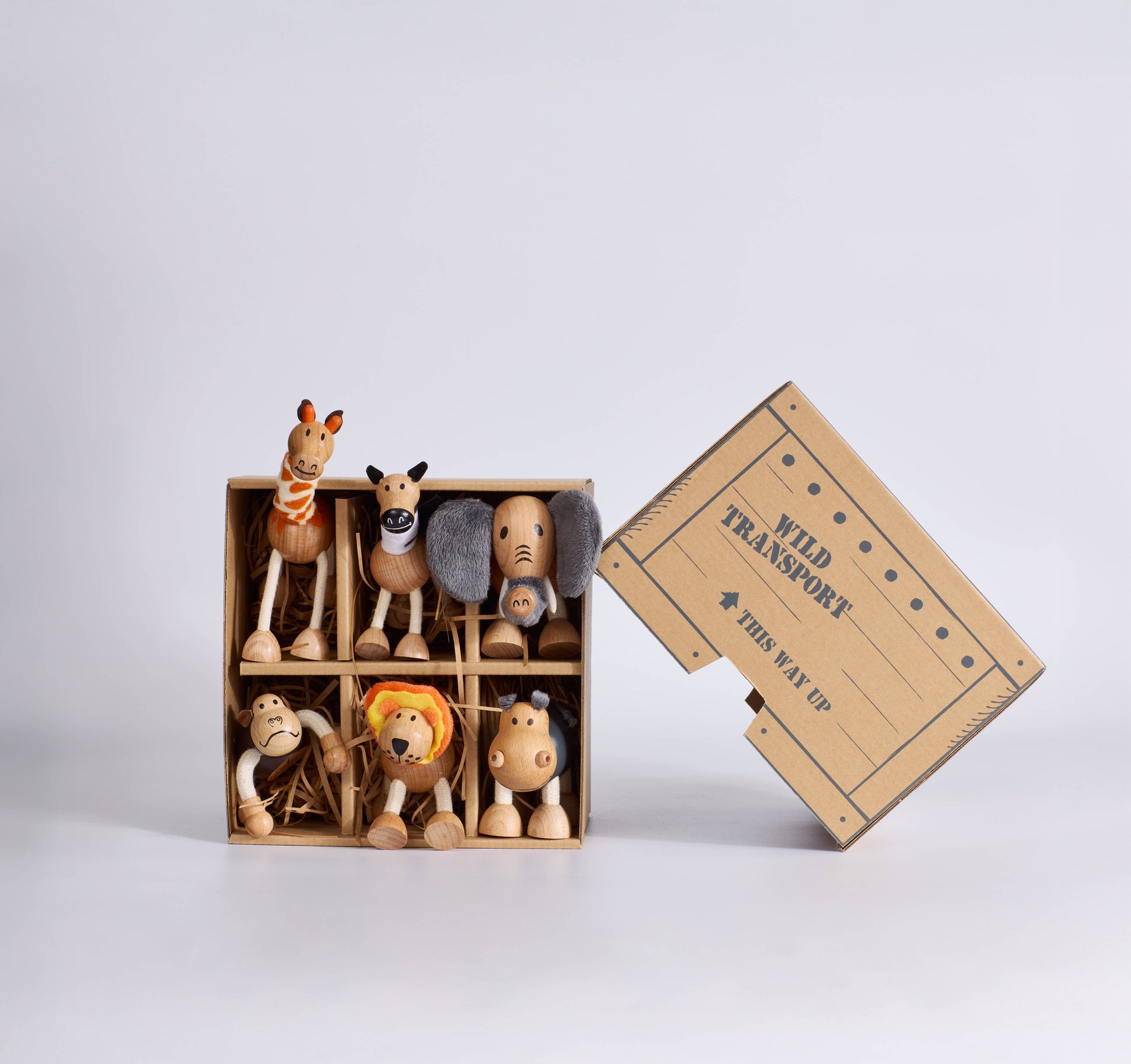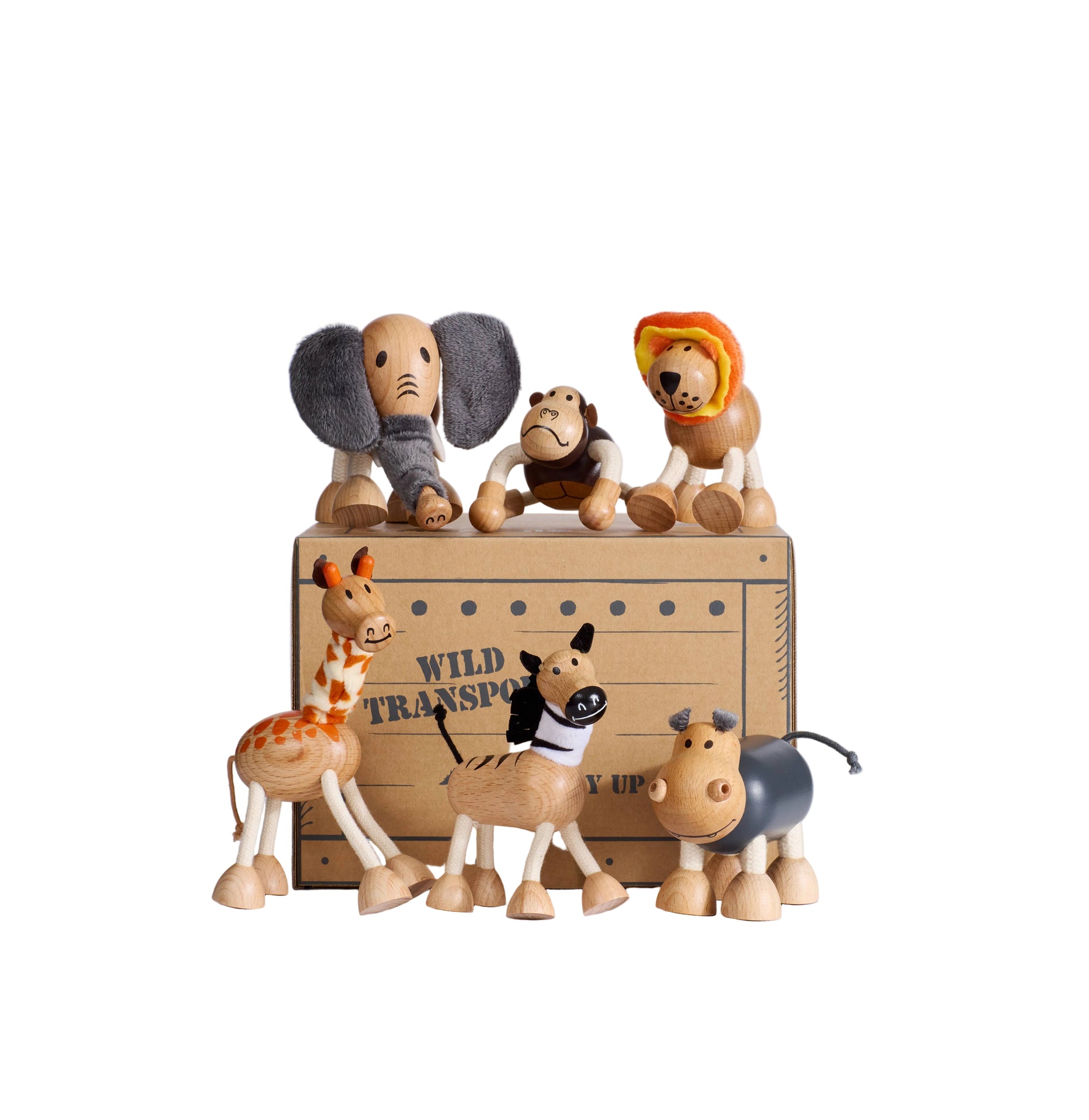 What’s Inside • Elephant – 9 cm x 11 cm • Giraffe – 13 cm x 9 cm • Gorilla – 10 cm x 6 cm • Hippo – 9 cm x 11 cm • Lion – 9 cm x 10 cm • Zebra – 9 cm x 9 cm • Soft, comfy crate padding Why You’ll Love It • Made from sustainable FSC wood, plush fabric + rope • Designed for ages 3+ • Encourages storytelling + wild roleplay • Backed by our lifetime guarantee • Comes in a gorgeous gift-ready crate