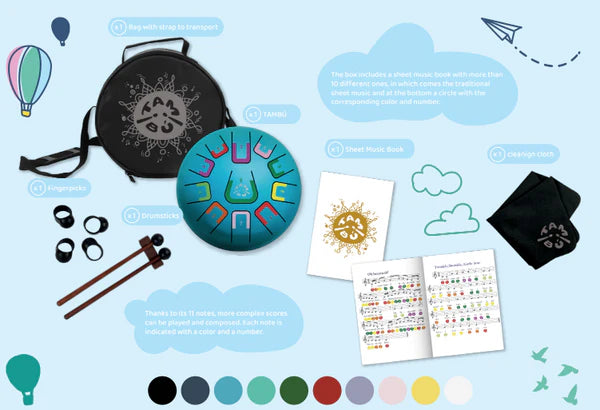 Tambú is an innovative tongue drum designed for all ages. It allows you to create harmonious melodies from the very first moment, with no prior musical knowledge required.