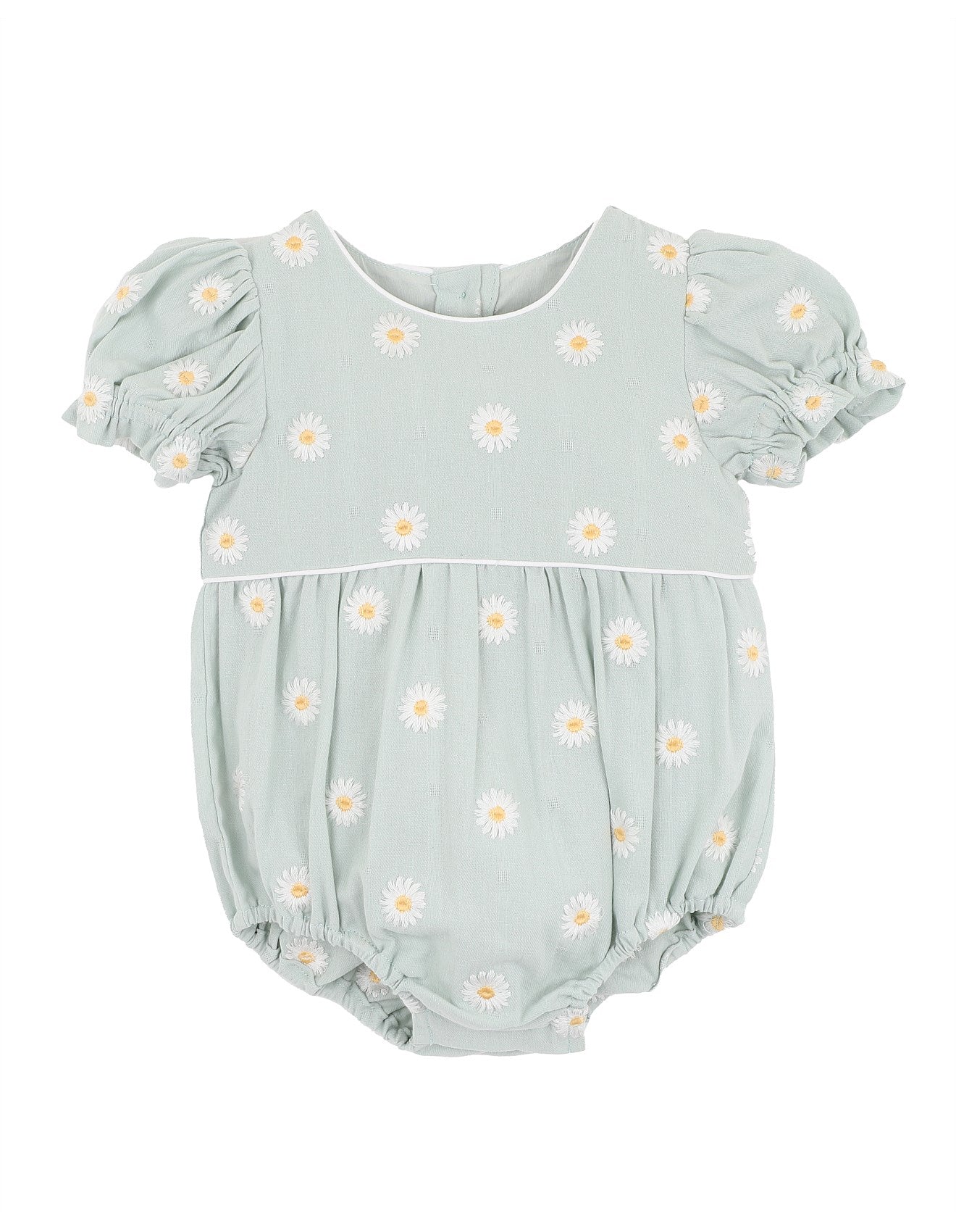 A fresh take on florals, this soft sage romper is sprinkled with playful embroidered daisies for a sweet vintage feel. The bubble silhouette and puff sleeves make it a timeless choice for warm-weather outings or milestone moments, all crafted in breathable 100% cotton for all-day comfort.