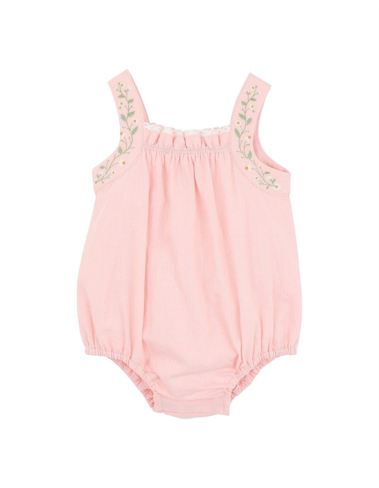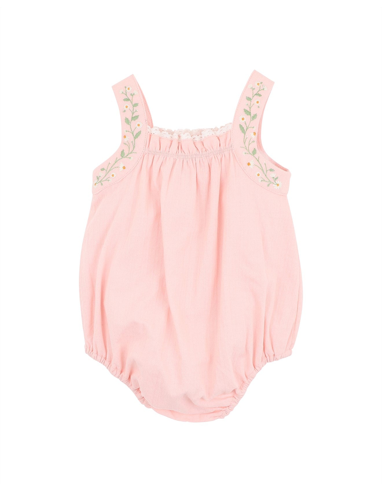 A charming summer piece made for sun-filled days, this sweet romper features delicate embroidery trailing up each shoulder strap, and a soft lace trim peeking from the neckline. Gentle elastic at the legs and back makes for a snug, comfy fit ¿ perfect for play or special outings.