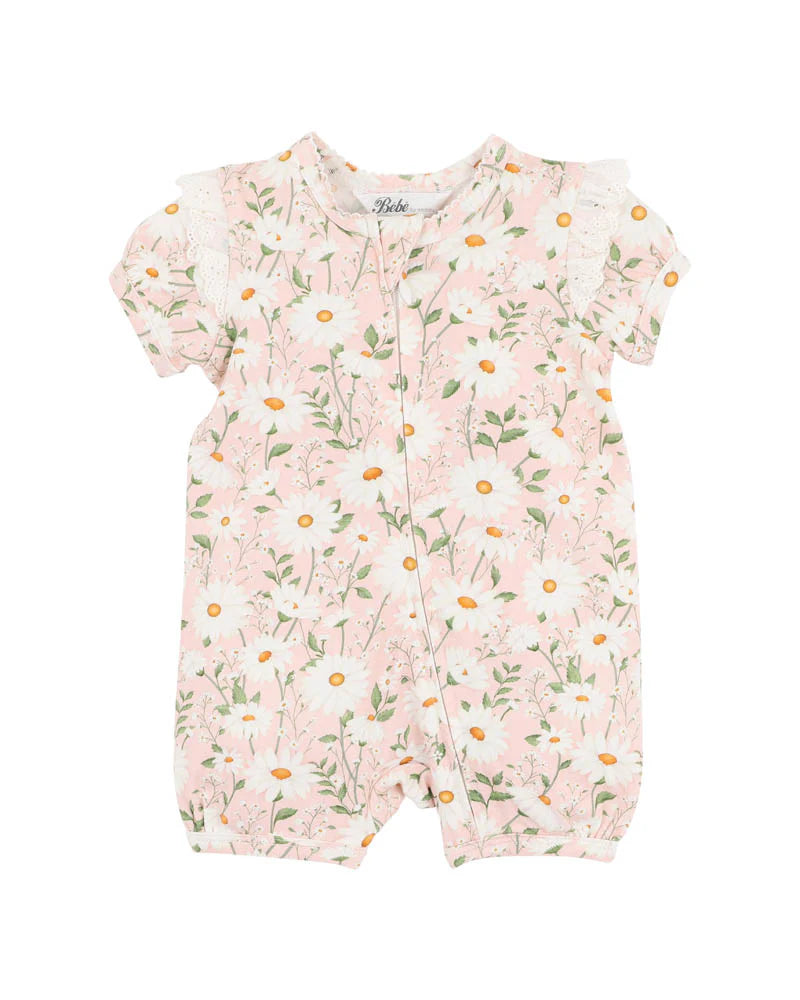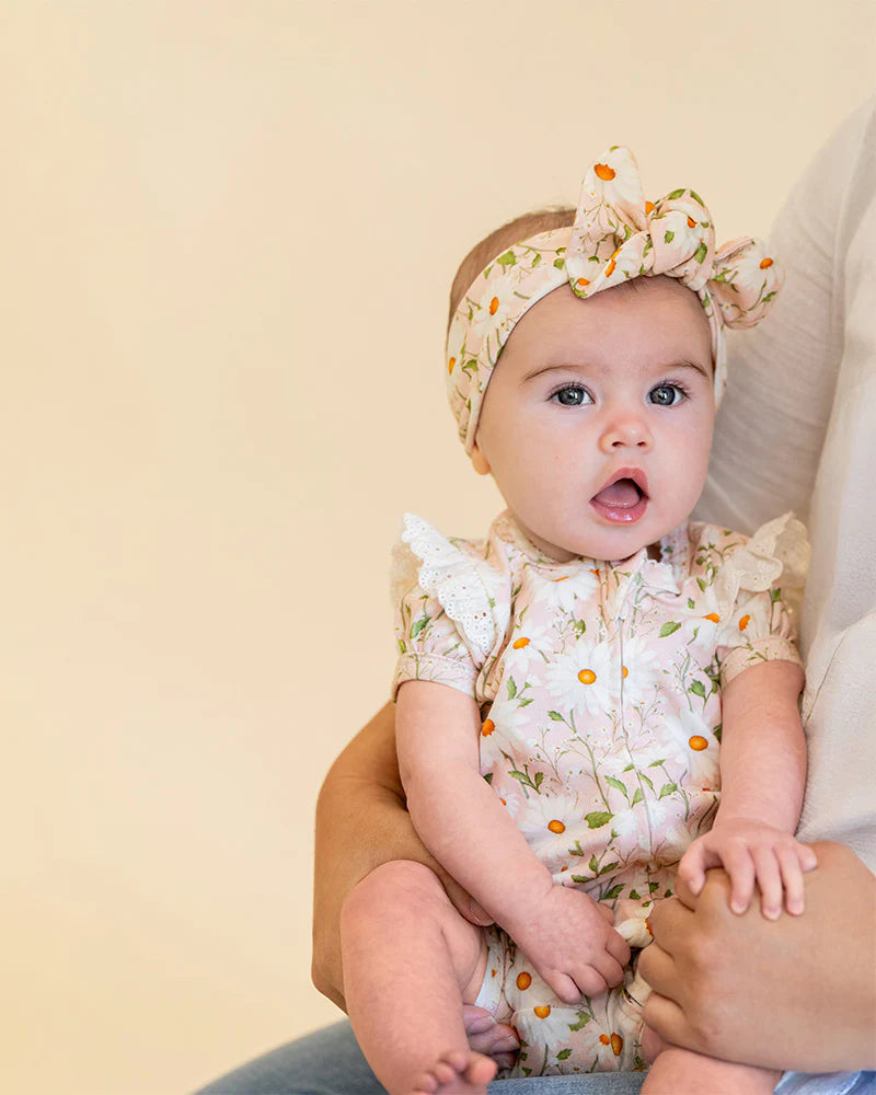 Full of sunshine and sweet vintage charm, the Tess short sleeve zipsuit is made for play, cuddles and everything in between. Crafted from a soft and comfy cotton elastane blend in a delicate daisy print, it features fluttery broderie anglaise sleeves and gentle gathers at the leg. A concealed zip front makes changes quick and easy — perfect for busy little days. Match it back with the Tess headband for a cute matching outfit and gift.