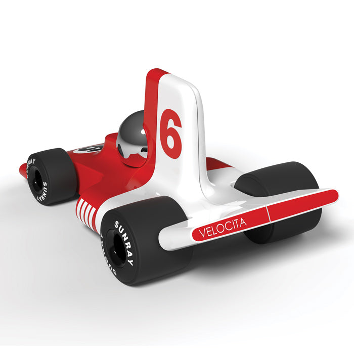Verve Velocita Jean is inspired by the F1 scene of this era. Rubber tyres, stream-lined shapes and vibrant, shiny colours, one of the coolest cars ever made! Its miniature size is perfect for kids.