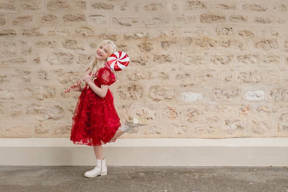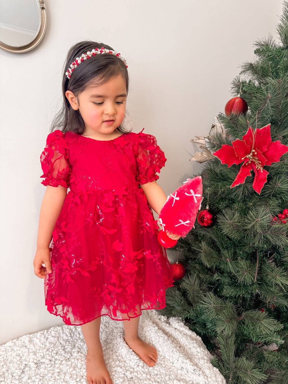 A Festive Favourite for Magical Holiday Moments The Vienna Dress in vibrant Christmas red is a beautifully detailed choice for your little one’s special season. Designed as a standout girls Christmas dress, it features intricate 3D floral embroidery with just a touch of sparkle - perfect for adding a little magic to your family photos and holiday events. Soft puffed sleeves, an elegant V-back with pearl button detailing, and a full tulle bow make this dress feel extra special. The knee-length cut makes it easy to move in while still looking polished, whether she’s attending a Christmas concert or celebrating with loved ones. Fully lined with 100% cotton for breathable comfort, the Vienna Dress is designed to keep her feeling happy and confident all day long.
